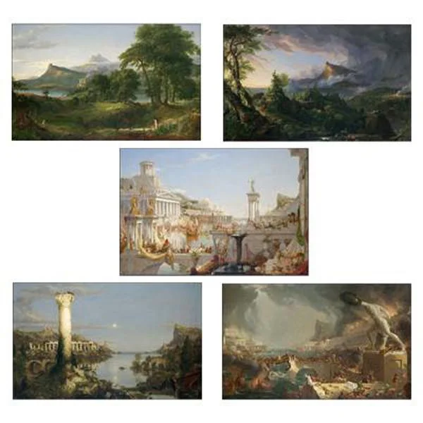 "I like the sequence of paintings in The Course of Empire the most because the cycle of all the paintings is accurate. The first picture has a sun rising and it keeps following the course of the daily sun's rotation. What makes this unique is that the sun's positions make it seems as though it all all happens in one day. There is a calming sense of coming full circle with the cycle of nature and its conflict with man. Even as they tried to conquer nature, they destroyed themselves, and nature prevailed."